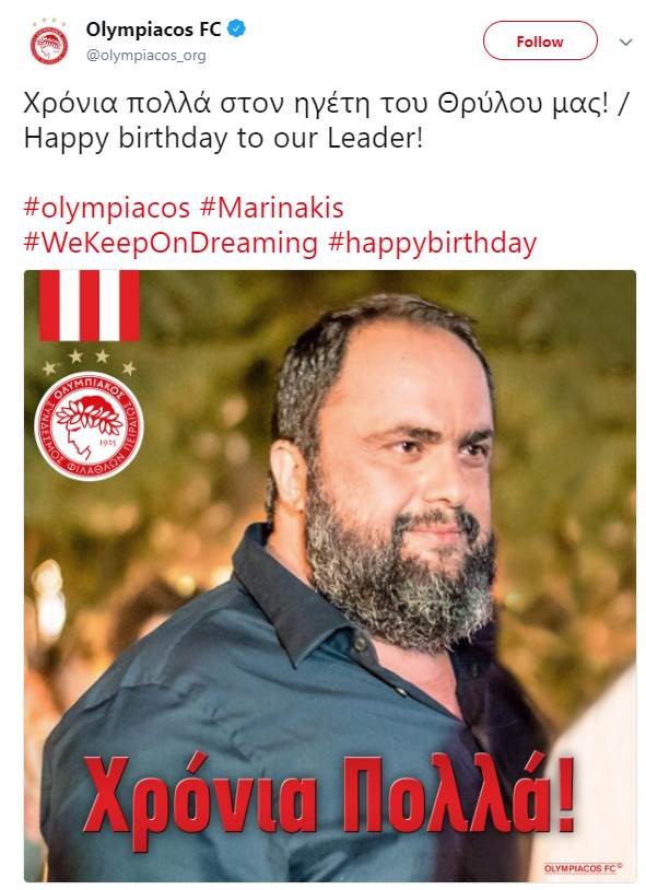 Η ΠΑΕ Ολυμπιακός με ανάρτηση στα social media εύχεται χρόνια πολλά στον Βαγγέλη Μαρινάκη για τα γενέθλιά του.